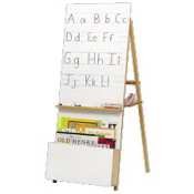 Item #: BLT33170. Big Book Easel offers a natural oak construction with a single-sided, write-on/wipe-off surface. Wooden pegs on trays hold books, charts and posters. Storage box and tray included for markers, supplies, books, posters or charts.