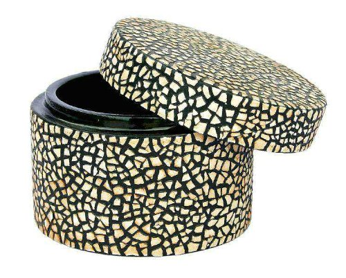 Use this decorative black lacquer box with eggshell design as an accent piece, jewelry box, or for storing those everyday necessities. The exterior is overlaid with actual fragments of crushed eggshell, creating an elegant statement of natural simplicity and a one-of-a-kind retro-style design. The eggshells are thoroughly cleaned and spread out on paper to dry. Once dry, the shells are cracked into small pieces and applied to the black lacquered surface. A few more coats of clear lacquer are then applied on top of the eggshell to complete this captivating design. The shiny black base is produced through the application of seven layers of lacquer followed by a two-month drying process, resulting in its rich luster. Northern Thai lacquerware is well known to interior designers worldwide, and is acclaimed for some of the globe's finest craftsmanship techniques. Lacquerware is created by applying the black resin of the "Lak" tree onto smoothly carved wood to give it a glossy finish. This unique piece is made by talented artisans in the historical Golden Triangle region of northern Thailand, and will bring their time honored traditions into any home or office space. Made from strong, durable mango wood, it measures 4 inches in diameter x 3 inches high. This creation has been entirely handmade by skilled Thai artisans using only the finest natural materials. AsiaEXP scours the globe to bring you authentic handcrafted treasures made by talented artisans. By shopping with us you not only acquire an exceptional handicraft, but also support Asian artisans and their ancient creative traditions. The handcrafted nature of this creation will produce minor differences in design and sizing. Subtle variations will occur from piece to piece, adding to the unique quality of individual items. Measurements are approximate. Read more...