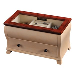 The gracefully curved shape of this jewelry box, its footed base, and its delightful walnut & creme finish give it a fantastic look. A clear glass lift lid lets you see inside. Its main compartment has one set of ring rolls flanked by two open sections, and there is one additional open drawer. Read more...